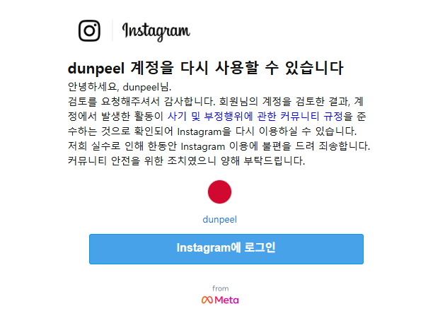 그리고 오늘 (5월 7일) 마침내 영구정지된 인스타그램 계정을 복구했다.