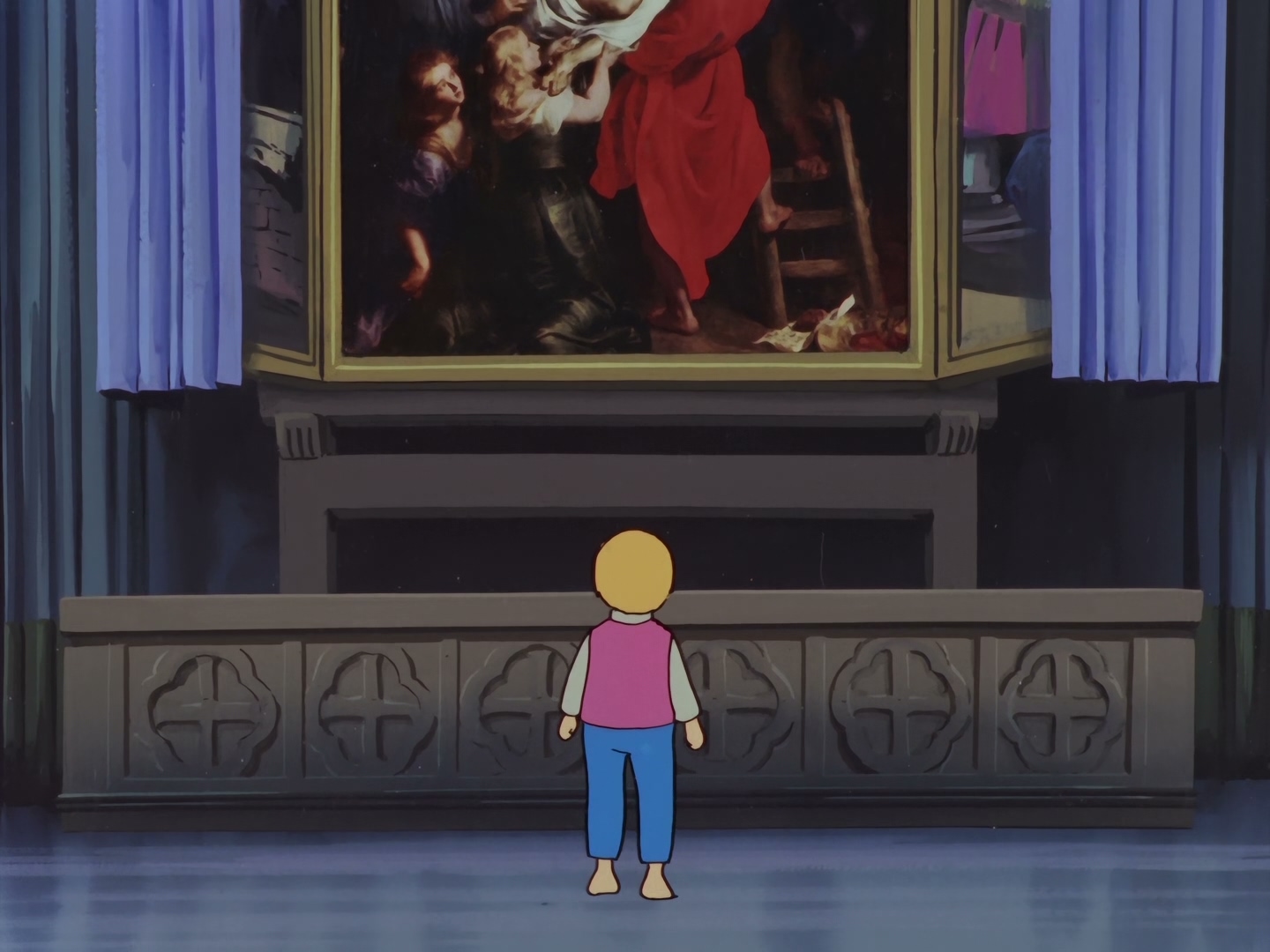 이런 네로에게 한가지 소원이 있다. 그것은 안트베르펜 대성당에 가려져 보이지 않는 루벤스의 자품, < Raising of the Cross >와 < Descent of the Cross > 를 보는 것이다. 하지만 작품을 보기 위해선 금화 한닢이 필요하다. 가난한 네로는 돈이 없기에 성당앞을 지날때면 마음이 아프다.